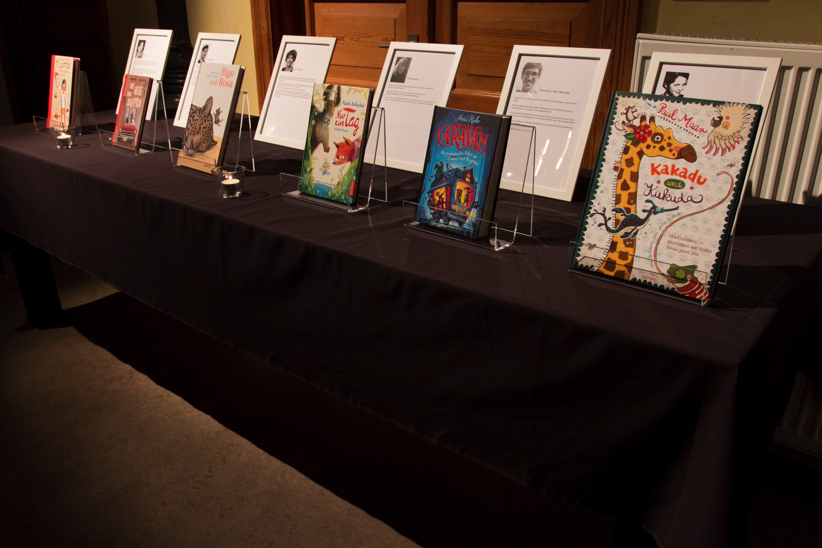…wurden noch ein paar Fotos für die Presse gemacht. In der Mitte steht Patrick Wirbeleit, der Iniziator des Preises, mit dem Gewinnertitel in seinen Händen: Das Buch „Goldkind“ der Dramatikerin Eva Rottmann, illustriert von Eleanor Sommer, erschien 2015 beim mixtvision Verlag.
