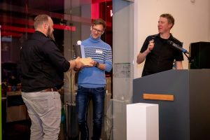 Hier sehen wir die höchst erfreute Preisträgerin Eleanor Sommer sowie den ebenso erfreut wirkenden Stifter des Preises Mano Eckhoff, dem Geschäftsführer der Carl Buch Elektrotechnik GmbH & Co.KG.